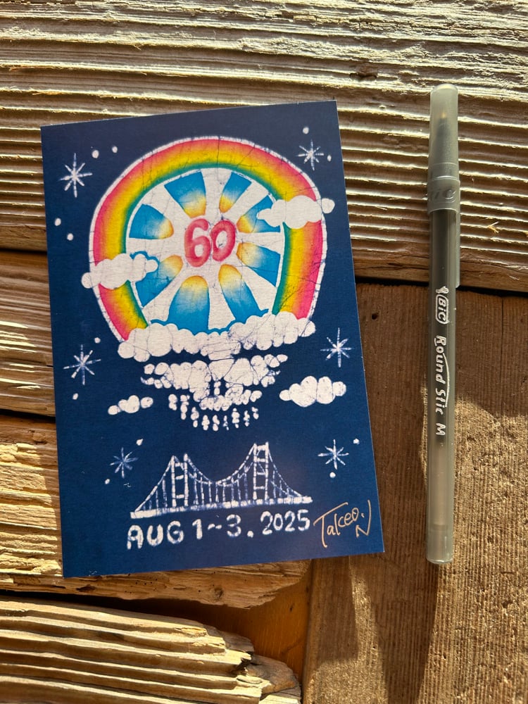 This is a small postcard with a batik print to celebrate Dead's 60th anniversary. It's signed in the bottom right.