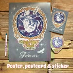It comes as a set of three items: sticker, postcard, and poster.